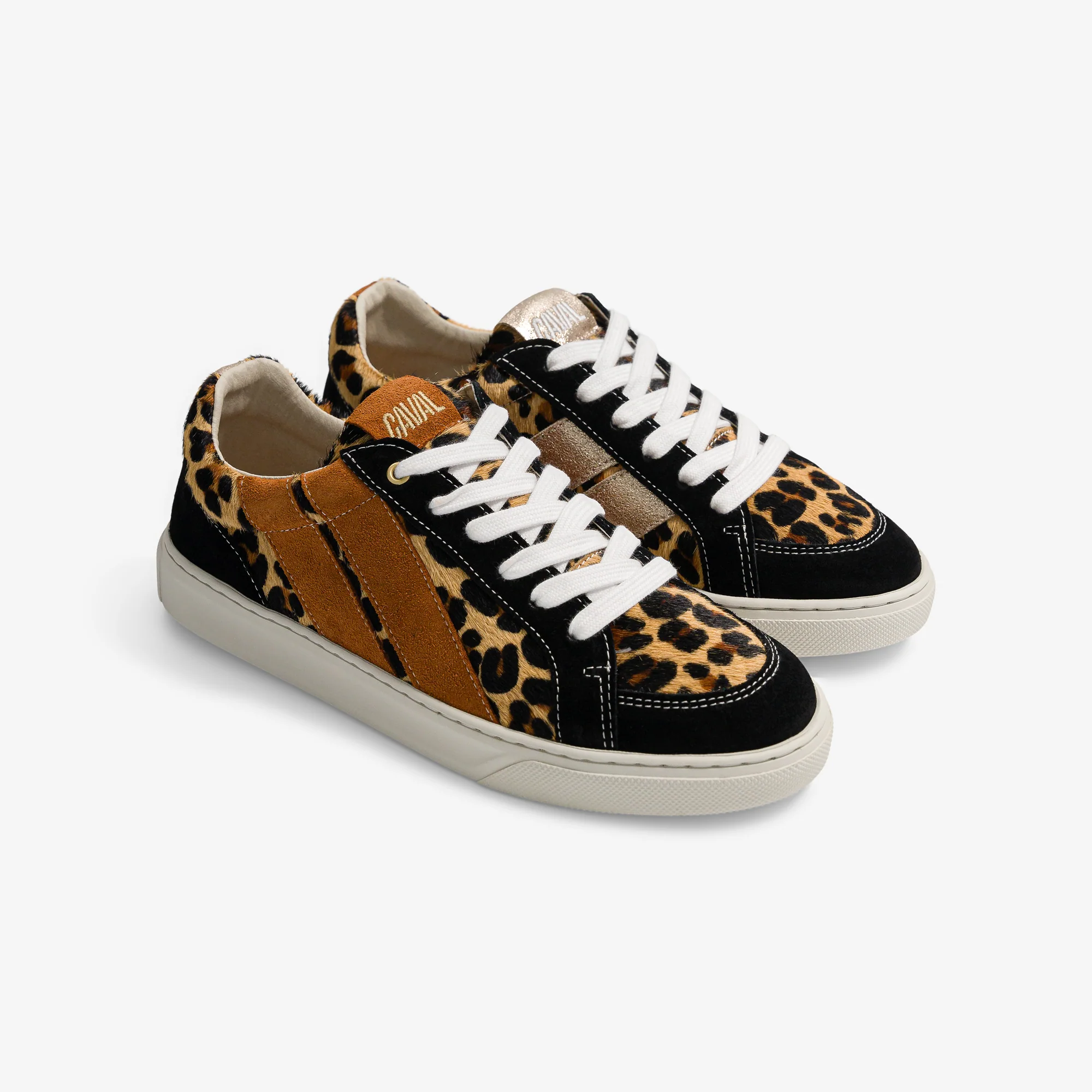 Wild und samtweich: Die asymmetrischen Leo-Sneaker aus der CAVAL x Des Petits Hauts-Kollektion zeigen ein Raubkatzenmuster, warme Farben und doppelte Kontraststreifen. Unisex, nachhaltig produziert in Europa.