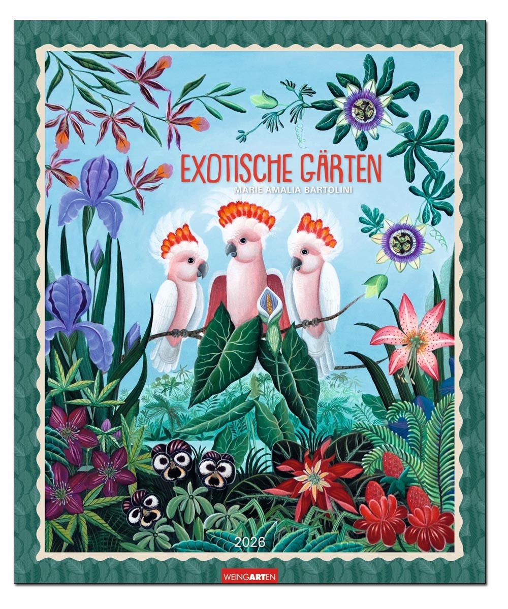 Ein farbenfroher XXL-Wandkalender (46 × 55 cm), der mit Kunstdrucken in Spitzenqualität exotische Gärten und Tiere in Szene setzt. Die leuchtende Farbwelt von Marie Amalia Bartolini weckt Kinderträume und Märchen – naive Malerei at its best. Ein moderner Blickfang und das perfekte Geschenk für Kunstliebhaber:innen (Weingarten / Athesia Kalenderverlag).