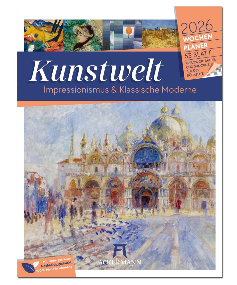 53 prominente Kunstwerke und Künstler:innen aus dem 19. und 20. Jahrhundert begleiten dich Woche für Woche – wie ein kleiner Museumsbesuch zu Hause. Mit übersichtlichem Kalendarium (25 × 33 cm) hast du Platz für Termine und Notizen, dazu gibt’s auf jeder Rückseite Kreuzworträtsel und Sudokus. In Deutschland auf Papier aus nachhaltiger Forstwirtschaft produziert, mit Spiralbindung und deutschsprachigem Kalendarium.
