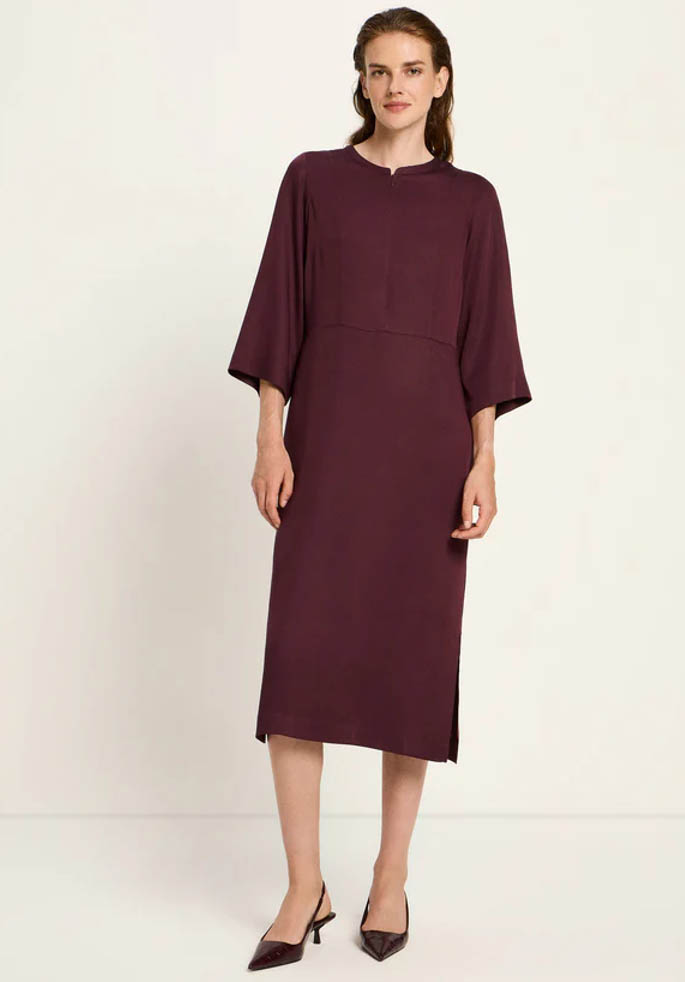 Midikleid aus 100% TENCEL™ Lyocell – weich fließend, atmungsaktiv und mit elegantem Glanz. Gerader Schnitt mit ¾-Ärmeln, Seitenschlitzen und variablem Reißverschluss am Rundhalsausschnitt. Vielseitig kombinierbar – von elegant bis lässig.