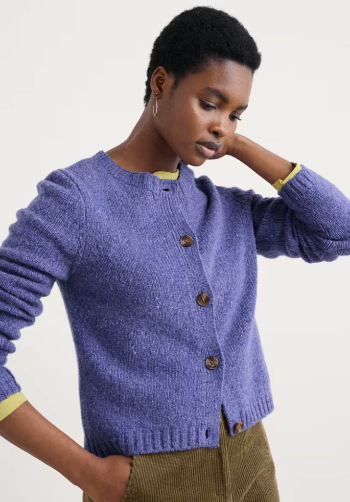 Cardigan aus Merinowolle und recyceltem Nylon – besonders weich, langlebig und warm. Dicht gestrickt im 3-Gauge mit dezent melierter Optik. Schmaler Schnitt mit hohem Rundhalsausschnitt, Knopfleiste und klassischen Rippabschlüssen.