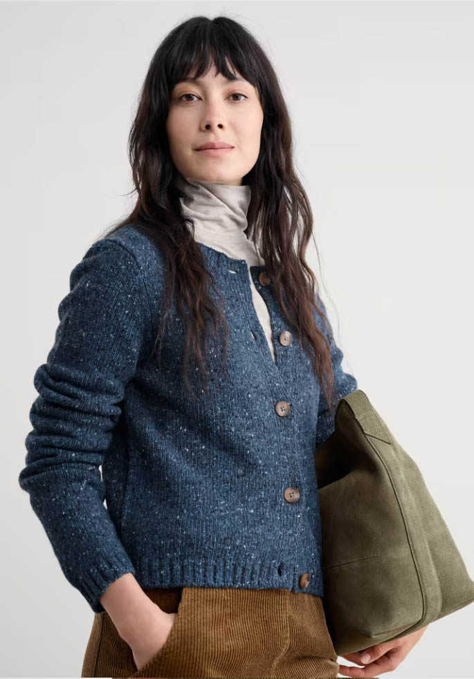 Cardigan aus 70% Merinowolle und 30% recyceltem Nylon – besonders weich, langlebig und formstabil. Kompakt gestrickt (3-Gauge) mit dezent melierter Optik, die herrlich warm hält. Schmaler, gepflegter Sitz mit hohem Rundhals, durchgehender Knopfleiste und Rippbündchen.
