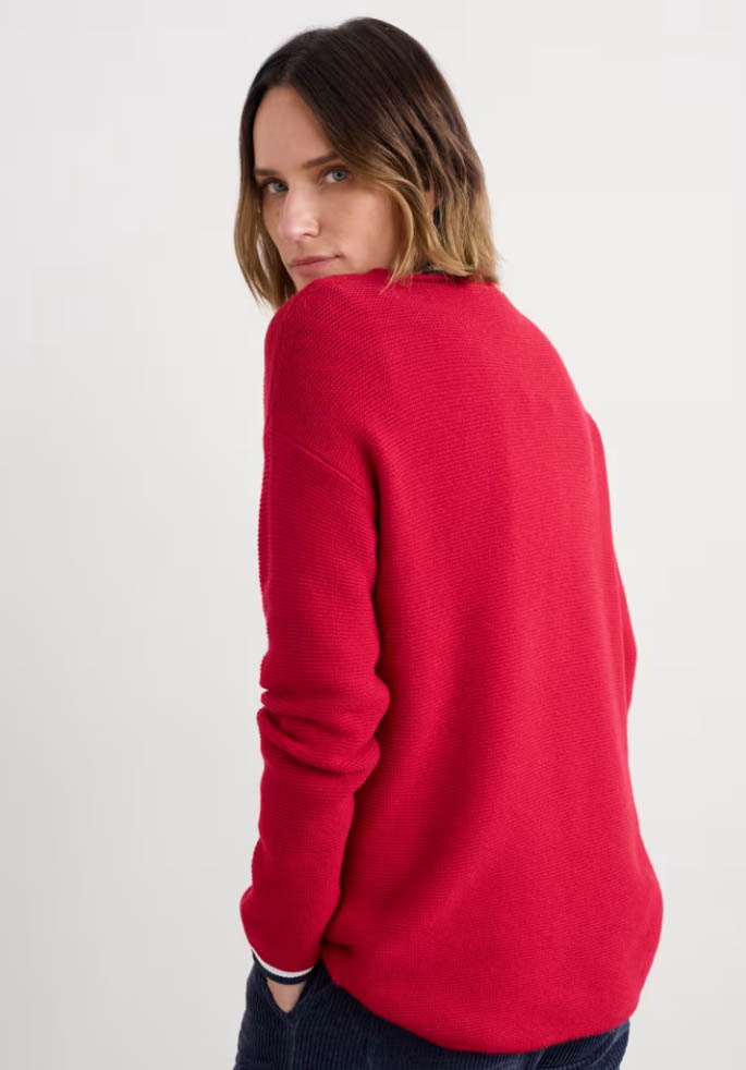 Lässig oversize geschnittener Pullover aus weichem, merinoreichem Garn mit feiner Struktur. Bootsausschnitt mit Rollkante und gerippter Saum, hinten leicht verlängert, für eine entspannte Silhouette. Vielseitig zu Jeans oder gemusterten Röcken; Material: 80% Merinowolle, 20% recyceltes Nylon.