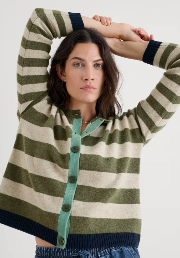 Statement-Cardigan mit kräftigen Streifen und spannenden Farbkontrasten – ein echter Blickfang. Mittelschwer gestrickt, weich und bequem mit lässiger Passform und überschnittenen Schultern. Material: 80% Lammwolle für kuschlige Wärme, 20% recyceltes Nylon für zusätzliche Robustheit.