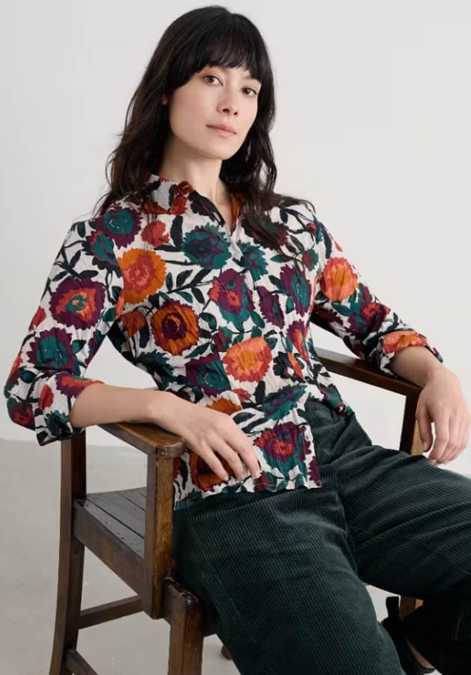 Ganzjahresliebling aus weicher Bio-Baumwolle mit lässiger Crinkle-Struktur – einfach waschen, eindrehen, kein Bügeln nötig. Halbtaillierter Schnitt mit langen Ärmeln und Knopfschlaufen zum bequemen Aufkrempeln. Jede Saison mit beliebten Designerprints; Material: 100% Bio-Baumwolle.